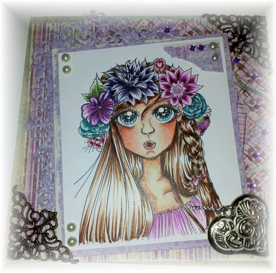 Oh wauw, dat plaatje is super mooi ingekleurd, ik zit te genieten van de mooie bloemen en haar haren...knap gedaan Cora. En je hebt er een lieve kaart omheen gebouwd.